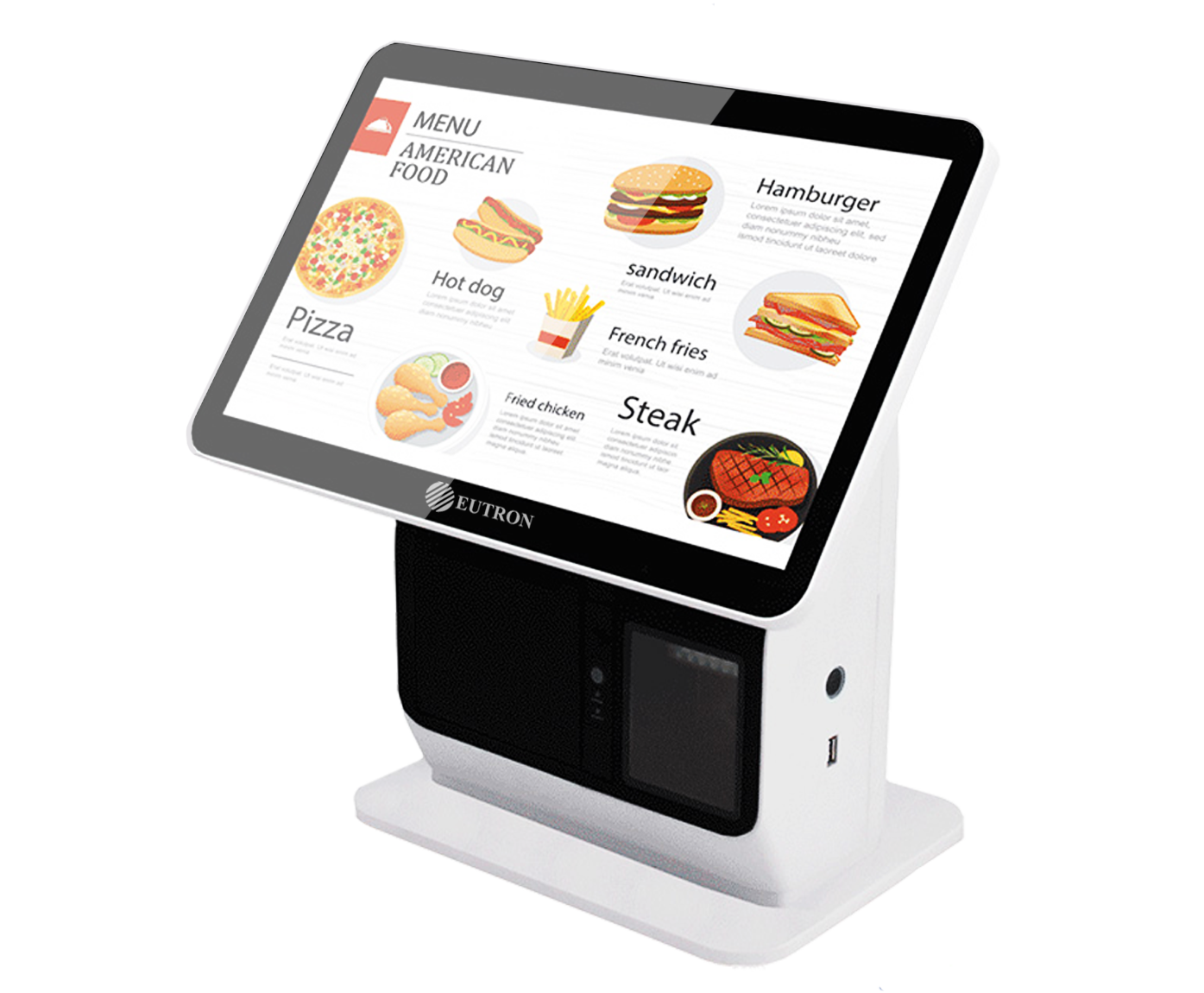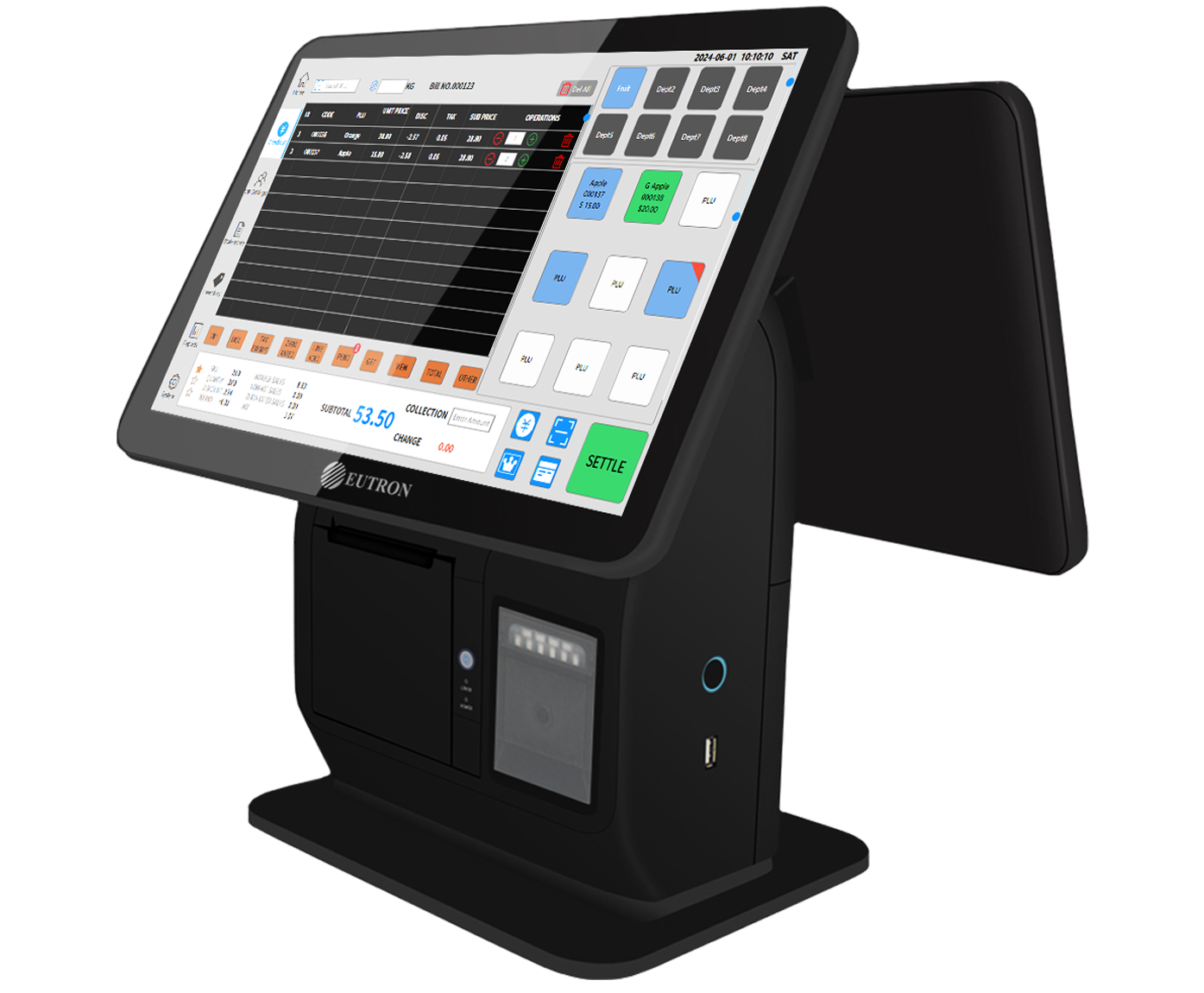 product description:Ultra-thin 15.6”& 15”industrial square screen for main display Customer display are optional for 15.6”,15” 11.6”,LED8, VFD Built-in 58/80mm thermal printer.